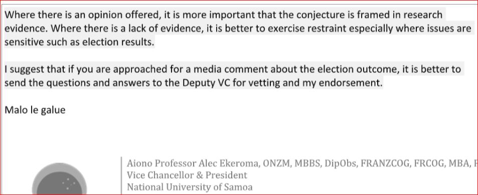 Na fa’asoa mai le Faiaoga e fa’apea ua fa’asa taputapu e Aiono ni Polofesa sinia ole Iuniveseta e iai tomai i le su’esu’eina o fa’afitauli i Atunu’u fa’atemokarasi fa’apea ma le aganu’u Samoa ma tulafono e fa’atatau i nei mataupu. Na taumafai le Nofoilo Samoa e fa’atalanoa Faiaoga Sinia o le Iuniveseta ae na fa’apea mai e le mafai ona latou talanoa mai i Tusitala.